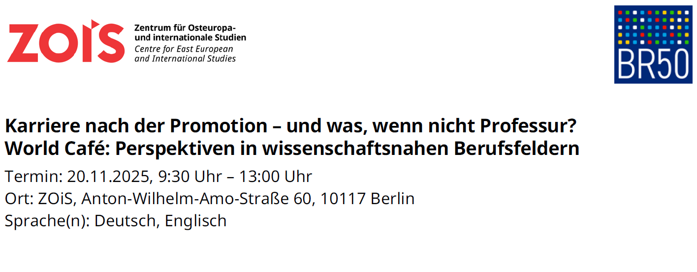 The Centre for East European and International Studies (ZOiS) and the BR50 Interest Group IG Third-Party Funding and Career Advice jointly offered an event in World Café format to highlight alternative career paths. Around 20 PhD candidates had the opportunity to talk to five experts about science-related career fields.